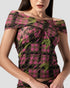 بلوزة مطبوعة مكشوفة الأكتاف بتفاصيل منسدلة. تتميز بنقشة مربعات متعددة الألوان بدرجات زاهية من الوردي والأخضر والأسود. مصممة بفتحة رقبة متقاطعة تُبرز خط الكتف وتُضفي عليه مظهرًا جذابًا. قصة ضيقة بلمسة عصرية، مثالية لإطلالات مسائية راقية أو تنسيقها مع بناطيل وتنانير عالية الخصر.