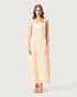 فستان ميدي بتأثير الساتان، بأشرطة عريضة وياقة مستقيمة. يتميز بقصة ضيقة تمتد على طول الصدر وتنورة انسيابية لإطلالة أنيقة وبسيطة. قفل جانبي غير مرئي.