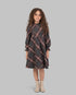Knee-length plaid dress, with long sleeves.